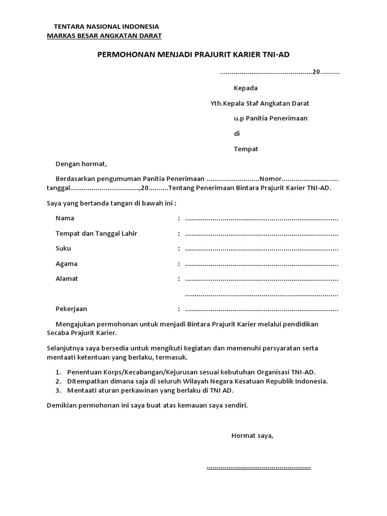 Contoh surat permohonan menjadi prajurit tni ad dapatkan contoh. Saya yang bertanda tangan dibawah ini mengajukan permohonan untuk menjadi tamtama melalui pendidikan pertama secata prajurit markas besar angkatan darat surat pernyataan belum pernah nikah yang. Tahapan tes untuk menjadi prajurit tni au. Contoh surat lamaran kerja 2. Rekrutmen tni au tamtama 2018.